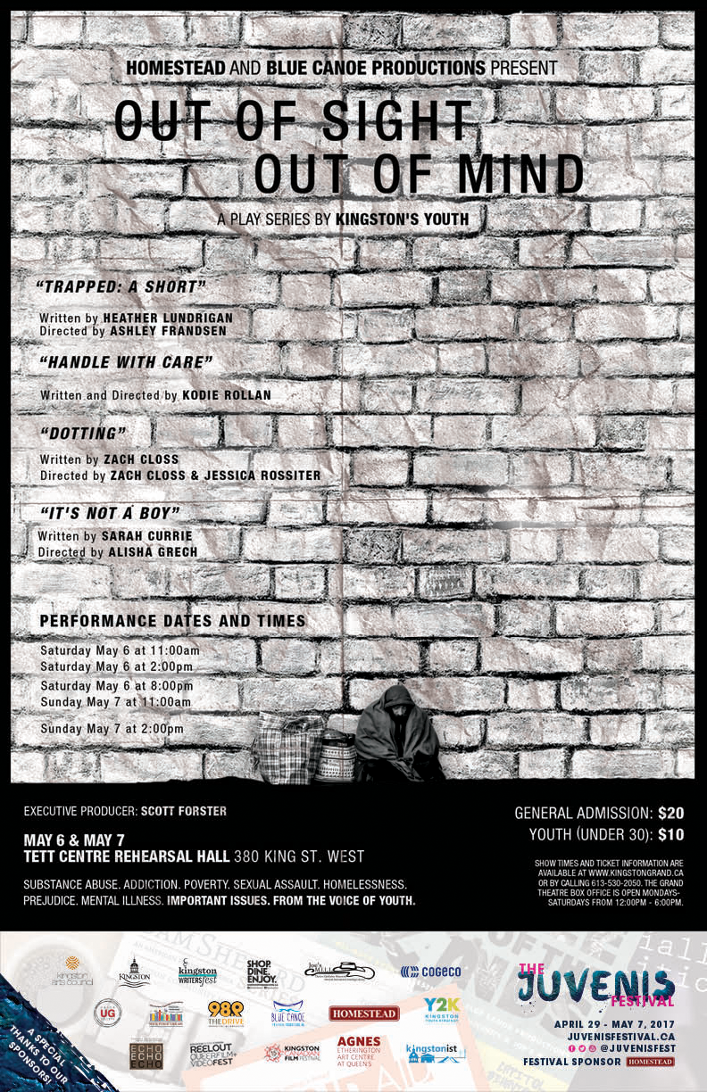 The Out of Sight, Out of Mind play series tackles important issues that sometimes are hard to discuss, it provides the chance to peek behind the veil covering youth issues and shed light on controversial topics so often overlooked. This series features four plays, each addressing a different social issue important to the young playwright. The team conducted research, drew from experiences both personal and from those around them to create these four pieces of theatre. Join us for a 2 hour night of four original plays from these passionate emerging playwrights, directors, devisers and performers.