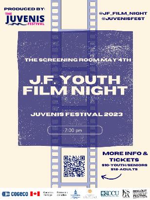 The J.F. Youth Film Night is a one night event in Kingston showcasing local youth made films this May. It is an opportunity for youth filmmakers to show their work and to connect with other artists within the community. Additionally, it's an opportunity to watch local talent on the big screen. Join us May 4th for this special event!